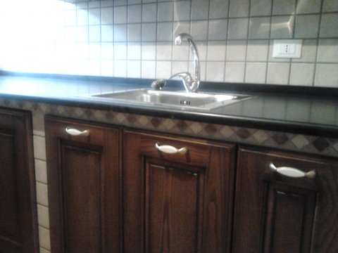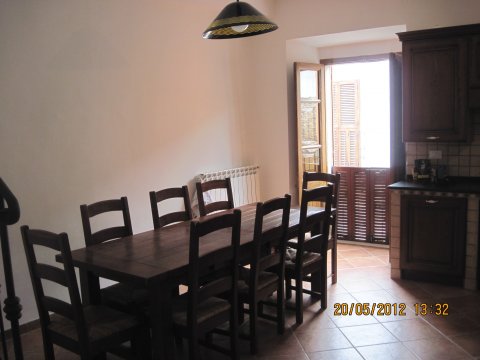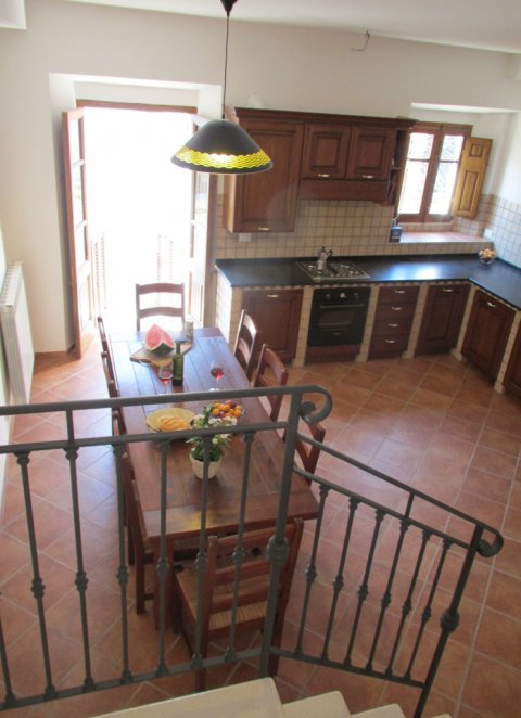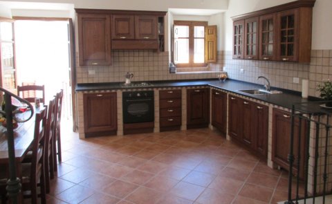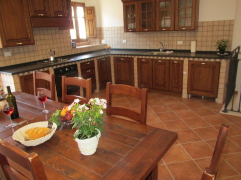Det store spisekøkken med langbord og plads til otte personer har indbygget opvaskemaskine, køleskab og separat fryser.